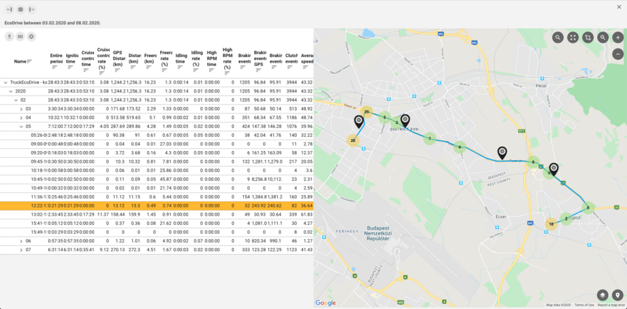 By clicking either on a selected section or a period that spans multiple sections in the table, the route is displayed on the map. The pins indicating brakings and clutch uses appear along the track. The pins are clustered depending on the zoom level. Clicking on the cluster will zoom in on the map and unfold the pins.