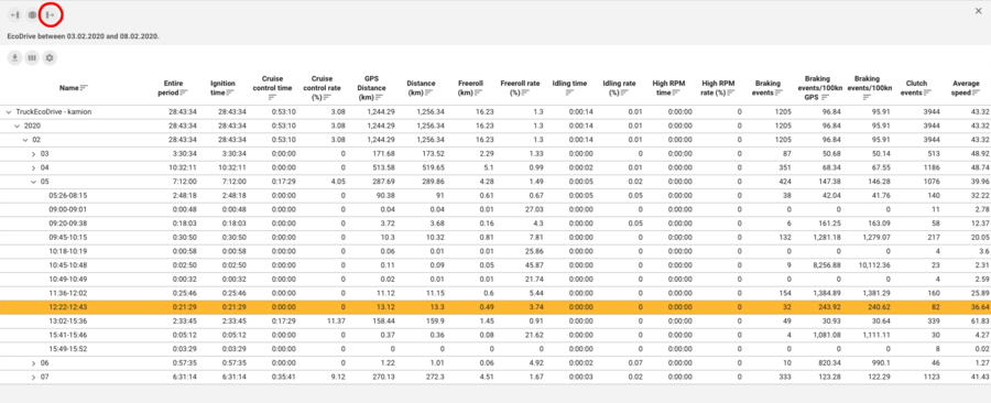The display of the result is assisted by the already familiar drop-down table, in which the routes are broken down by year / month / day / for each vehicle. Because many data types are displayed in the result of the query, the full list view, which can be displayed by clicking the control button in the upper left corner, will greatly facilitate interpretation.