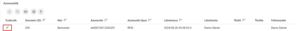 A táblázat soraiban található ceruza ikonra kattintva módosíthatjuk az adott bilétához tartozó adatokat, továbbá itt tudjuk az azonosítóról hozzárendelni a felhasználót is az adott bilétához.