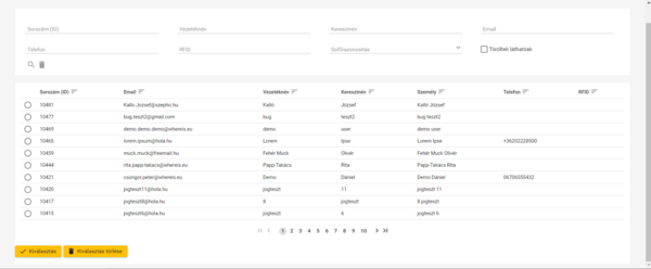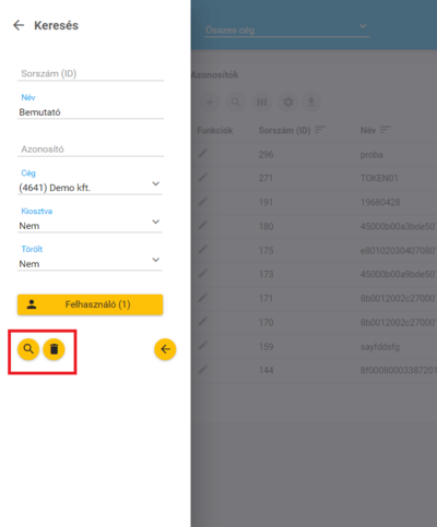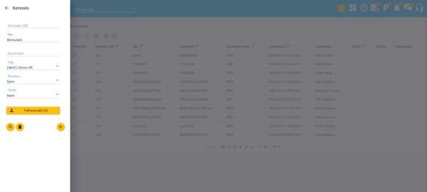 Az ikonra kattintva balról úszik be a keresés ablak, ahol sorszám, név, azonosító, cég, felhasználó vagy törölt státusz szerint is szűrhetünk. A felhasználó kiválasztása a már megszokott legördülő listázás szerint történik.