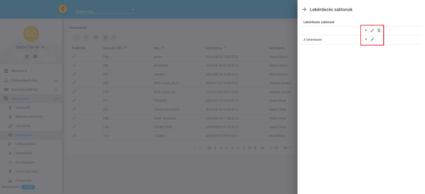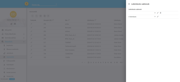 A fogaskerék gombra kattintva tudjuk megnyitni a lekérdezés sablonokat. A jobbról beúszó ablakon láthatjuk a lekérdezés sablonok listáját. Bal oldalt a sablon neve látható, jobbra pedig a műveleti gombok helyezkednek el. A háromszög gomb segítségével tudjuk futtatni a lekérdezést, a ceruza ikonnal módosítani azt, a szemetesládával pedig törölhetjük a nem kívánt sablonokat.