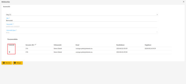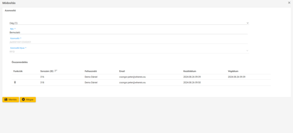 Amennyiben még nincs az azonosító felhasználóhoz rendelve, itt megtehetjük azt, ha már van aktív összerendelés, akkor az ablak legalján láthatjuk és a szemetesládával akár meg is szüntethetjük, ezután megjelenik a végdátum és eltűnik a szemetesláda ikon, az összerendelés megszűnt.