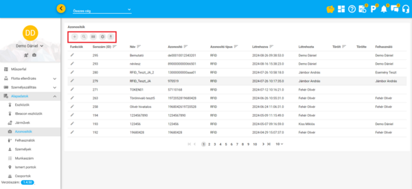 A táblázat felett találhatóak a műveleti gombok, ahol a felhasználó új azonosítót adhat hozzá a listához, szűrhet a lekérdezések között, lekérdezés sablonokat hozhat létre és futtathatja őket, továbbá exportálhatja XLS fájlformátumban az azonosítókat.