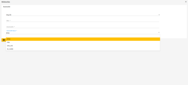 A + gombra kattintva tudunk új azonosítót létrehozni, amit később a felhasználókkal rendelünk össze. Először a céget kell meghatároznunk, -amennyiben több céghez van hozzárendelve felhasználónk-, amely a bilétát használni fogja, ezt követően adjunk nevet az azonosítónak. Az azonosító mezőbe kell bemásolni azt az RFID-t, amit emailben küldünk ki felhasználóinknak (egy azonosítóhoz egy RFID-t lehet rendelni), majd az azonosító típusnál válasszuk ki az RFID lehetőséget.