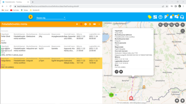 Ebben a fejezetben a Feladatkövetés típusú, speciálisnak mondható nyilvántartás típusról írunk részletesen. A kapcsolódó (fent felsorolt) súgó fejezetekben az egyedileg kialakított nyilvántartások azon fajtáival ismerkedtünk meg, amelyek a képernyőn a hagyományos, szűrhető, sorrendezhető listákból kiinduló, adatlap formátumú felhasználást teszik lehetővé. Ezekben a nyilvántartásokban mint rendszerszintű alapadat, megjelennek olyan információk, amelyek a flottakövető rendszerhez kapcsolódó információkat jelenítenek meg. Gondoljunk csak olyan nyilvántartásokra, ahol például egy kiszállásos szerviz szolgáltatást végző cég szeretné az ügyfeleknek végzett karbantartási és hibaelhárítási munkáit nyilvántartani, nyomon követni. A kialakított nyilvántartásban megjelennek olyan adatok hogy a szolgáltatást igénybe vevő ügyfél, az ügyfél telephelyének címe, hogy az adott szolgáltatást melyik szerelő végzi, illetve hogy a kiszálláshoz a vállalkozás mely gépjárművét használja. Mennyire kézenfekvőnek tűnik, hogy az adott napra szervezett munkákat ne csak egy szűrhető listában próbáljuk értelmezni, hanem térképes felületen követhessük nyomon a mai napra tervezett javítások helyszíneit. A feladatkövetés tehát egy feladat típusú egyedi nyilvántartás és egy aktuális pozícó felület ötvözése, azaz a kettő hibrid nézete.