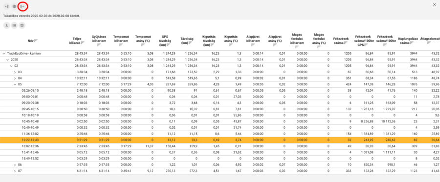 Az eredmény felületi megjelenítését a már megszokott harmónikaszerűen lenyitható táblázat segíti, amelyben az útvonalak járművenként év/hónap/nap/szakaszok szerinti bontásban szerepelnek. Mivel a lekérdezés eredményében sok adattípus jelenik meg, az értelmezést nagyban segíti a teljes listanézet, amely a bal felső sarokban elhelyezett vezérlő gombbal állítható be.