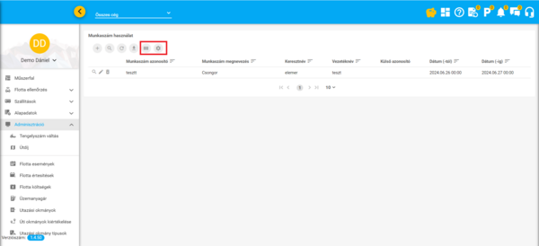 A ceruzával jelölt gomb mellett jobbra található a kuka ikonnal jelölt Törlés gomb, amellyel az adott munkaszám használat törölhető a rendszerből. A törlés végleges, az esetlegesen véletlenül törölt munkaszám összerendelés visszaállítására nincs lehetőség.