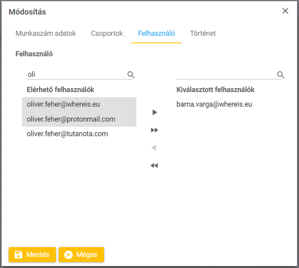 A felhasználó munkaszámhoz rendelésének módja, hogy a képernyő baloldali, Elérhető felhasználók listájából, a Kiválasztott felhasználók listájába mozgatjuk a kívánt elemet, majd mentjük az összerendelést. A megfelelő felhasználó kiválasztását a lista felett elhelyezett gyorskereső segíti, illetve a felhasználók csoportos hozzáadására is mód van. Ehhez a CTRL gomb nyomva tartása mellett kattintással lehet a listában kijelölni a mozgatni kívánt tételeket.