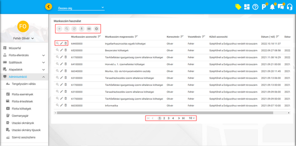 A lista dátumtól dátumig, egy-egy konkrét munkaszámra, partnercégre, valamint személyekre és járművekre szűrhető, az oszlopfejlécekre kattintással sorrendezhető. A lista alatt lapozó elem található.