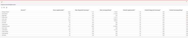 Az eredményt az alapértelmezett sorrendű sofőrökre bontott táblázatban láthatod, amelyben személyenként a meghatározott időszakokon belül hónapokra vagy évekre bontva , üzemanyagtípussal és a pénznemmel feltüntetve a különböző adatok.