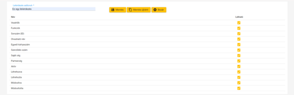 Pipáljuk be a látni kívánt oszlop négyzetét. Ezután adjunk nevet a lekérdezés sablonnak, a Mentés gombbal megkapjuk a lekérdezést, a Mentés újként gombbal pedig elmenthetjük a sablonok közé.