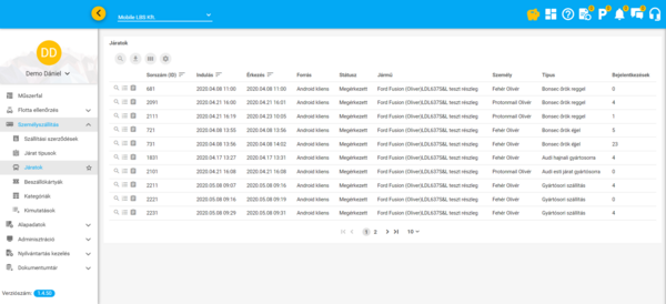 A járat adatait, státuszának változásait, illetve a járaton történt azonosításokat a WEB-es felület, Szállítások ⇒ Járatok listáról indítva lehet megtekinteni.