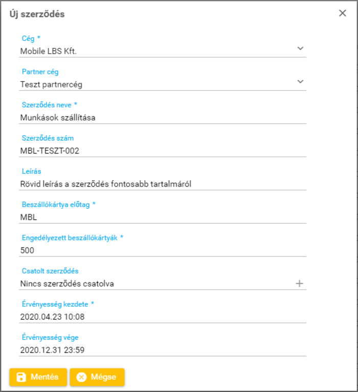 Szállítási szerződés rögzítése során az alábbi adatokat lehet és kell megadni, rögzíteni. A kötelező adatokat csillagozással jelöljük.