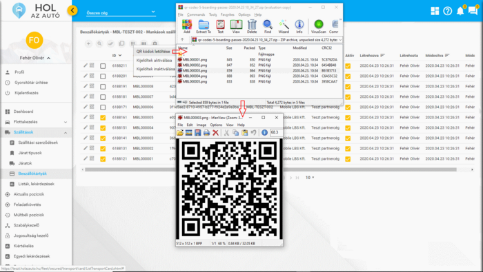 A tömörítvény tartalma tehát az 5 db beszállókártyának qr kódját tartalmazó képfájl, ahol a képfájlok elnevezése megegyezik a beszállókártya egyedi kártyaszámával.
