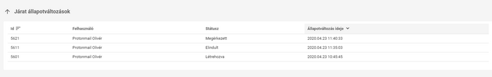 A listában az adatbázis azonosító mellett megjelenik a változást előidéző felhasználó neve, a beállított státusz, illetve a státusz beállításának időpontja.