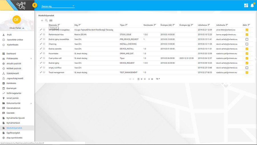 A menüpont kiválasztásakor azok a munkafolyamat definíciók jelennek meg, melyek a flottakövető rendszer fejlécében kiválasztott céghez vannak rendelve. Amennyiben ott nincs cég kiválasztva, a felhasználó által kezelhető összes cég, összes munkafolyamat definíciója a listába kerül, az információ hogy a definíció melyik céghez lett létrehozva, ilyenkor plusz oszlopként jelenik meg.