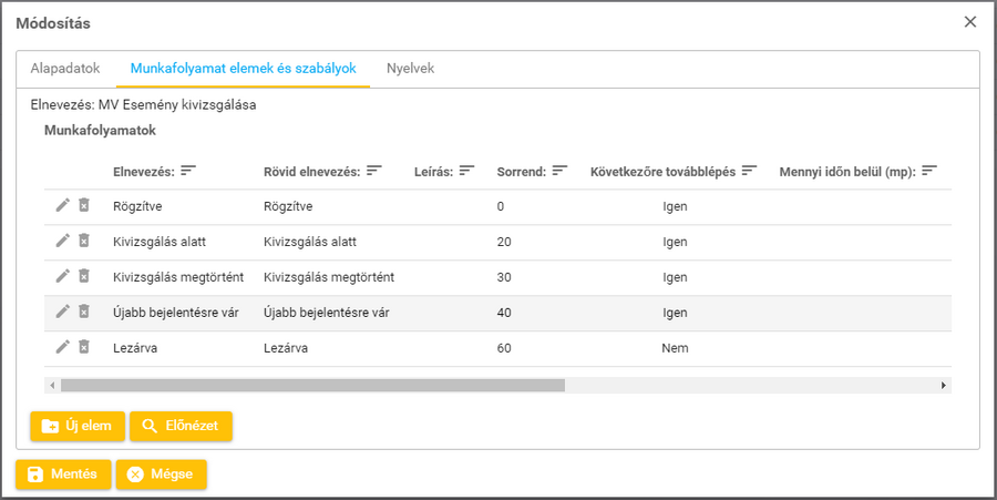 A munkafolyamat elemének hozzáadását az Új elem gombbal indítjuk. A megjelenő ablakban az alábbi adatok, összefüggések rögzítésére, beállítására van mód.
