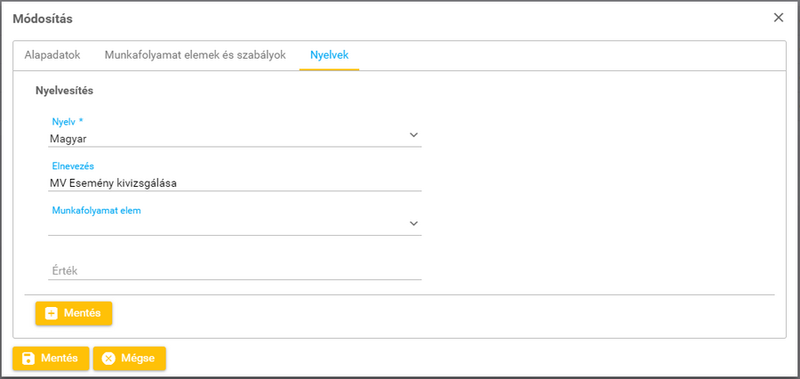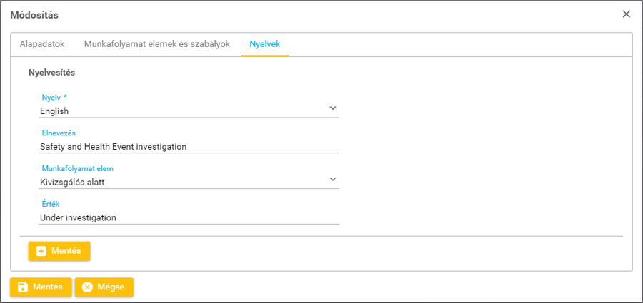 A fülre váltva a munkafolyamat neve jelenik meg azon a nyelven, ahogy az eredeti nyilvántartás rögzítve lett. A nyelvi adatok rögzítése a nyelv választásával kezdődik, melyet követően a nyelvválasztó alatt rögtön megadható ennek az adatnak a kiválasztott nyelvi verziója. A munkafolyamat elem kiválasztásával a legördülőben megjelennek a definiált munkafolyamat elemek az eredeti nyelven, a kiválasztás után az érték mezőben lehet megadni a fent kiválasztott nyelvhez tartozó fordítást. A rögzített nyelvi értéket a mentés gombbal lehet az adatbázisba menteni.