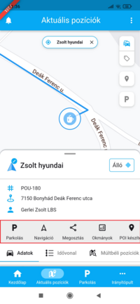 Itt fülek között lapozva válthatsz az Adatok, Idővonal, Múltbéli pozíciók, Kiértékelés és Értesítések funkciók között. Bármelyik fülre lapozol, mindegyik funkció az adott eszközre lesz előre beállítva, így például könnyen és gyorsan készíthetsz a térképről is múltbéli pozíciók lekérdezést az adott eszközre vonatkozóan.
