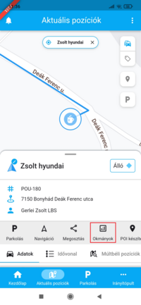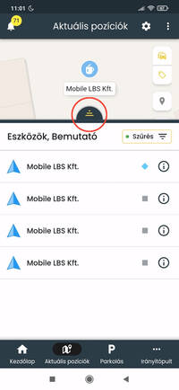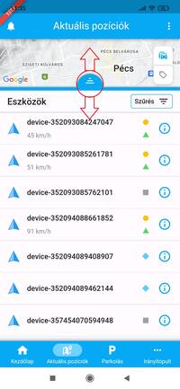 Ha egy adott eszköz pozíciójára vagy kíváncsi, a listában koppints rá, ekkor a térkép az eszközt fókuszba helyezi, ráközelít és a listában kék színnel kiemeli a kijelölt elemet. Ezzel egy időben az eszköz fölött megjelenik a nevet tartalmazó címke, amely mozgás esetén a pillanatnyi sebességet is tartalmazza. Ilyenkor a térkép követő módba kapcsol, a kiválasztott eszközt mozgás közben fókuszban tartja.