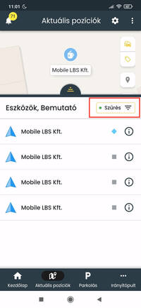 A webes felülettel megegyező módon a mobilalkalmazásban is elérhető az eszköz, a jármű és a személy (azonosított sofőrök) típusok megjelenítése. A listában és a térképen megjelenő tartalmat nem csak típus, hanem állapot és csoportba rendezés alapján is szűrheted.