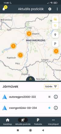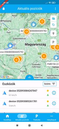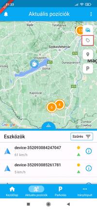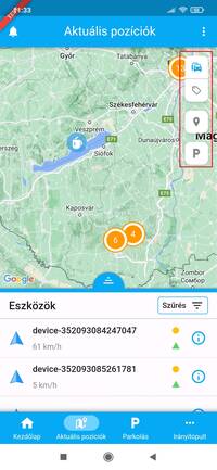 Az aktuális pozíciók felületén az általad megfigyelt eszközök valós idejű pozíciója, és a beküldött adatok követhetőek nyomon. A képernyő felső részén a térképes megjelenítés kapott helyet, amely alatt az eszközök listáját találod.