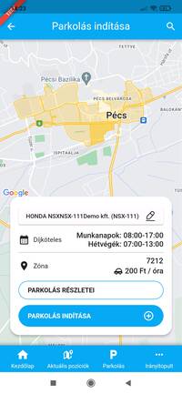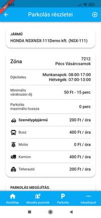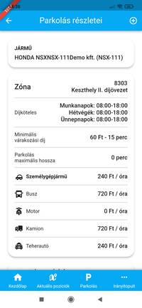 A parkolózónára koppintva egy felugró panelben tekinthetjük meg az adott zóna azonosítóját, díjköteles időszakait, illetve díjazását. A fejlécben az a jármű, eszköz szerepel, amellyel a parkolást végre szeretnénk hajtani, ezt a fejlécre koppintva módosíthatjuk.