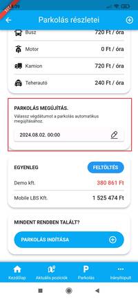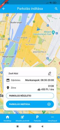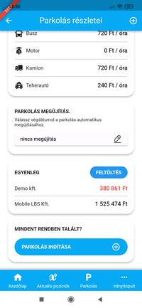 A parkolás indítása gombra koppintva azonnal meg is kezdhetjük a parkolást, míg a parkolás részletei gomb betekintést nyújt a parkolásra vonatkozó részletekbe, itt igény szerint a parkolás megújítására vagy az egyenleg feltöltésére is van lehetőség.