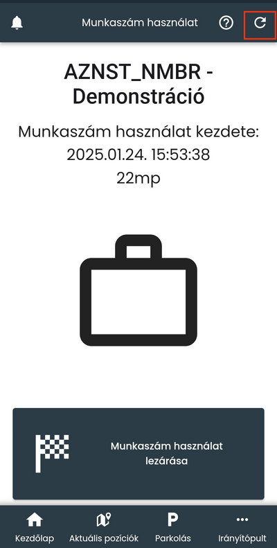 Az alkalmazás rendszeresen ellenőrzi az adott munkaszám használat státuszát, ugyanis a munkaszám használatokat a webes felületen is módosíthatod. Amennyiben a használat a webes applikációban lezárásra került, úgy ezt a változást az alkalmazás szinkronizálja. Az offline működés is megoldott a mobil kliensen, az offline állapotban létrehozott használatot rendszerünk szinkronizálja, amint helyreáll az adatkapcsolat. Bár az alkalmazás rendszeresen ellenőrzi a használat státuszát, a fejléc jobb szélén elhelyezett gombra koppintva manuálisan is frissítheted a használat állapotát.