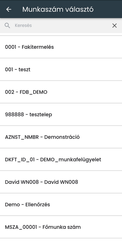 A gördíthető lista tetején található keresőmező segítségével a név és azonosító alapján is kikeresheted a megfelelő munkaszámot.