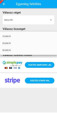A Feltöltés gombra koppintva az oldal átnavigál az egyenleg feltöltés felületére, ahol ki kell választanod legördülő listából, hogy melyik cégnek szeretnéd feltölteni az egyenlegét, illetve hogy mekkora összeget szeretnél hozzáadni. Jelenleg itt a gyors gombok közül van lehetőséged választani, azaz 10 000ft, 25 000ft és 50 000ft közül választhatsz. Amennyiben ettől eltérő összeget adnál hozzá, látogasd meg a webes felületet, ahol bármilyen 10 000-100 000ft közötti összeget feltölthetsz ezer forintra kerekítve.