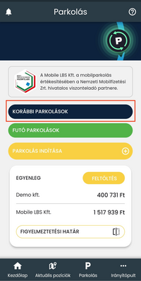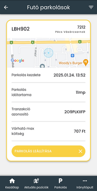 Az elindított, de még be nem fejezett, vagyis a futó parkolások vannak listázva ebben a menüpontban.