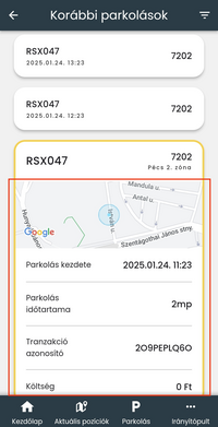 Itt láthatod a korábbi parkolások listáját, elemenként a rendszámot, dátumot és a parkoló zóna azonosítóját, azonban miután rákoppintasz egy adott elemre, részletesebb információk is elérhetővé válnak.