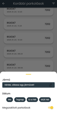 A fejléc jobb szélén található szűrőre koppintva keresni is tudunk különböző feltételek szerint a korábbi parkolásaink között.