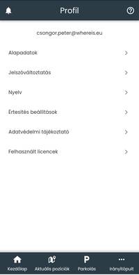 A profil menü felületén, a fejléc alatt a bejelentkezett felhasználó email címe látható. Az email cím alatt a következő funkciók és információk találhatók: